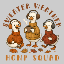 Bring playful fall vibes to your apparel with this “Sweater Weather Honk Squad” DTF transfer, featuring three adorable geese dressed in cozy sweaters and earmuffs, sipping warm drinks, and surrounded by autumn leaves. With its charming mix of humor and seasonal style, this design is perfect for sweatshirts, hoodies, totes, and tees. Ideal for pumpkin patches, fall festivals, or everyday autumn wear, it’s sure to be a customer favorite. Smash Transfers’ premium DTF process ensures bold colors, crisp details, and long-lasting durability on cotton, polyester, and blends. A must-have for anyone who loves quirky fall fashion and cozy sweater weather.
