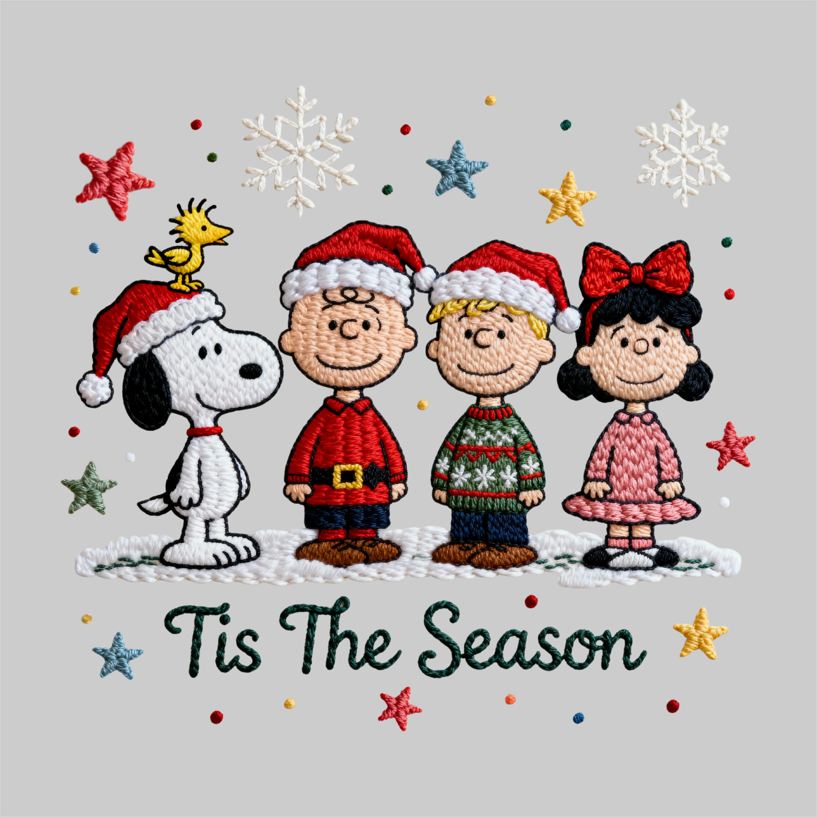Celebrate the joy of the holidays with this Tis The Season DTF Transfer, featuring a nostalgic cartoon-style group dressed in festive Christmas outfits surrounded by embroidered-look snowflakes and stars. This cheerful design captures the warmth and spirit of the season — perfect for creating cozy custom shirts, hoodies, or sweatshirts.